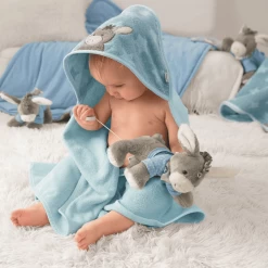 Badcape van zachte badstof, met geappliqueerd borduurmotief ezel “Emmilius”. De knuffelgarantie volgens de B aden .