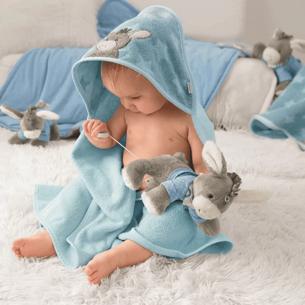 Badhanddoek van zachte badstof met geappliqueerd borduurmotief Donkey Emmi. De knuffelgarantie na de B aden .