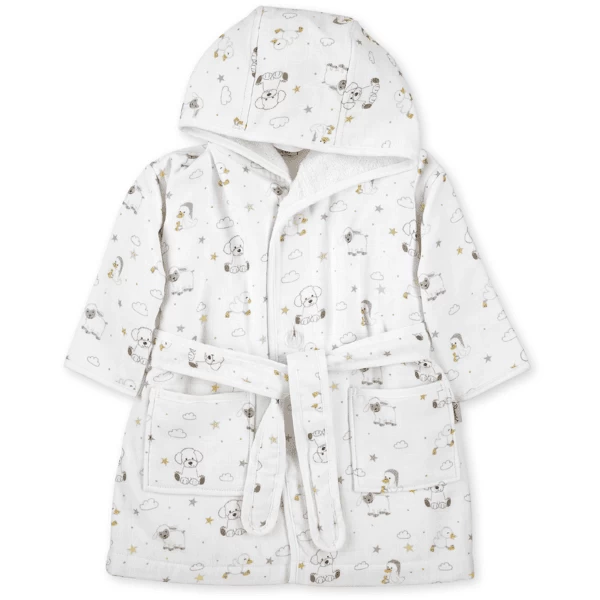 Badjas in mousseline, bedrukt met de motieven Hanno, Edda en Stanley, gevoerd met zachte badstof. Lekker warm na het badderen.