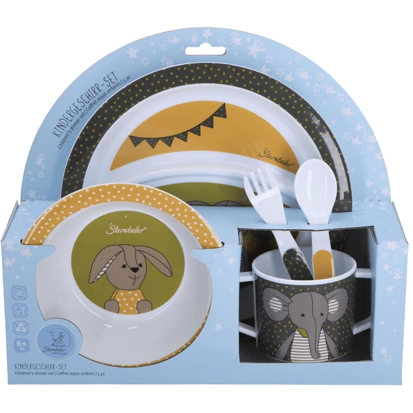 - Servies met prachtig motief olifant Eddy en konijn Happy bestaande uit bord, kom, beker met handvat, vork en lepel