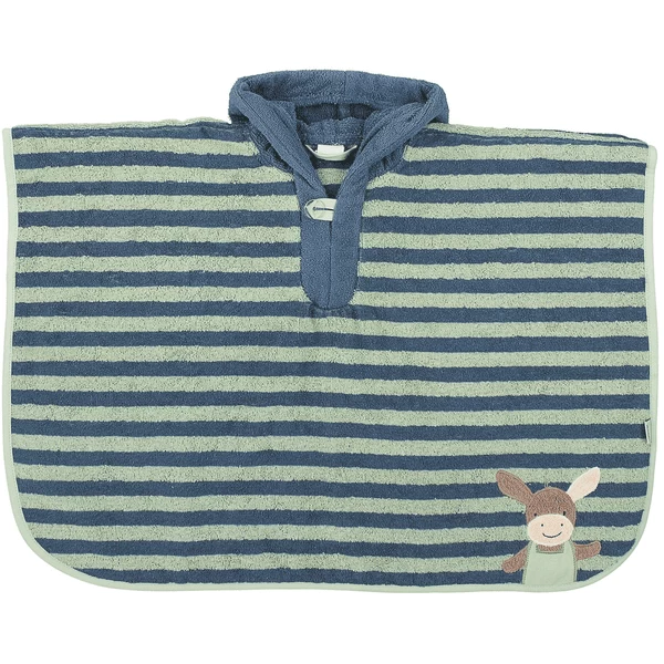 De praktische poncho van badstof met geborduurd ezelmotief “Emmilius” wikkelt uw kind lekker warm en zacht na de B aden .
