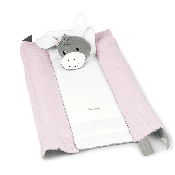De gepolsterde zijkanten helpen de baby om de deken niet zo gemakkelijk van de deken af te rollen. De kop kan ook apart gebruikt worden als knuffelkussen.