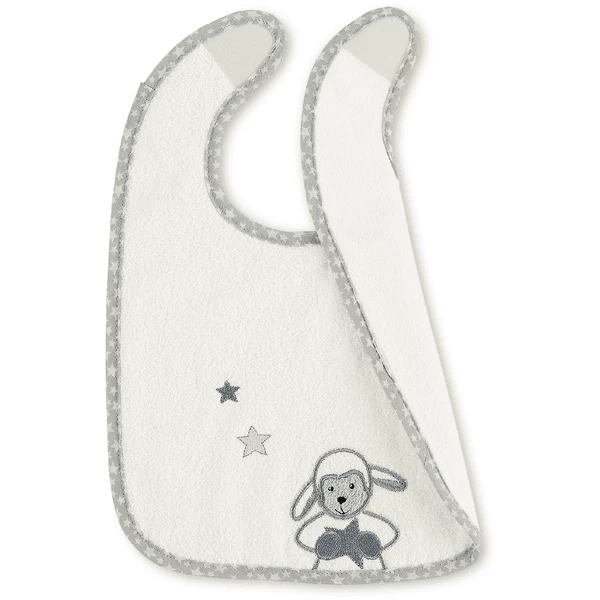 Praktisch plastic klittenband slabbetje voor het gemakkelijk aan- en uitkleden in zachte badstofkwaliteit. Met geappliqueerd borduurmotief schaap Stanley. De vochtbestendige rug beschermt tegen inweking.