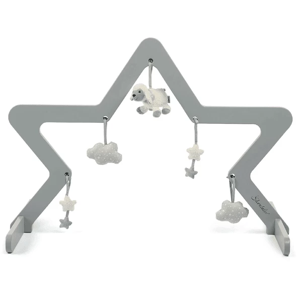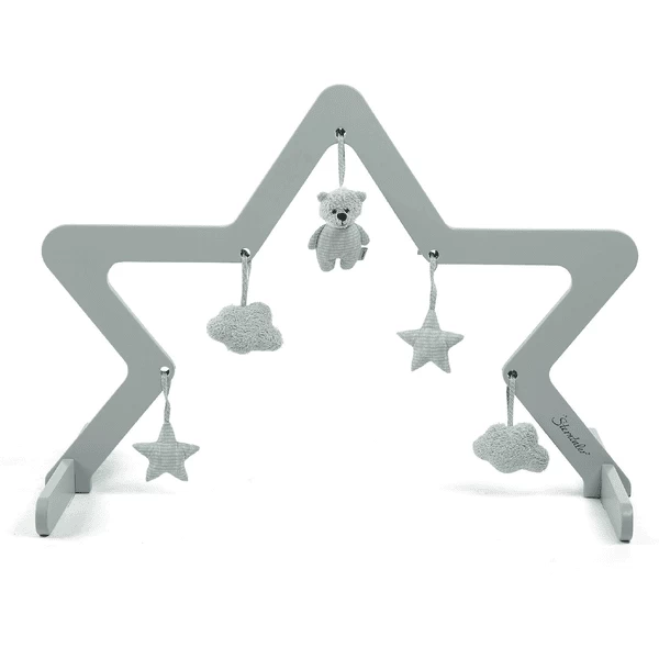 Speelboog houten ster (grijs) van Sterntaler. Op verschillende hoogtes zijn er bevestigingsmogelijkheden voor verschillende speelstukken, die steeds opnieuw kunnen worden geruild. Dit zorgt voor flexibiliteit en afwisseling.