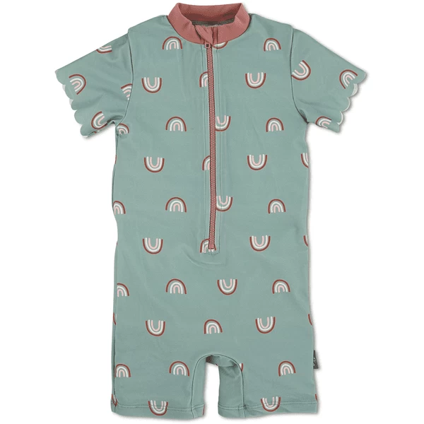 - Eendelig zwempak van badstof met spandex in regenboogpatroon.